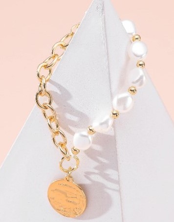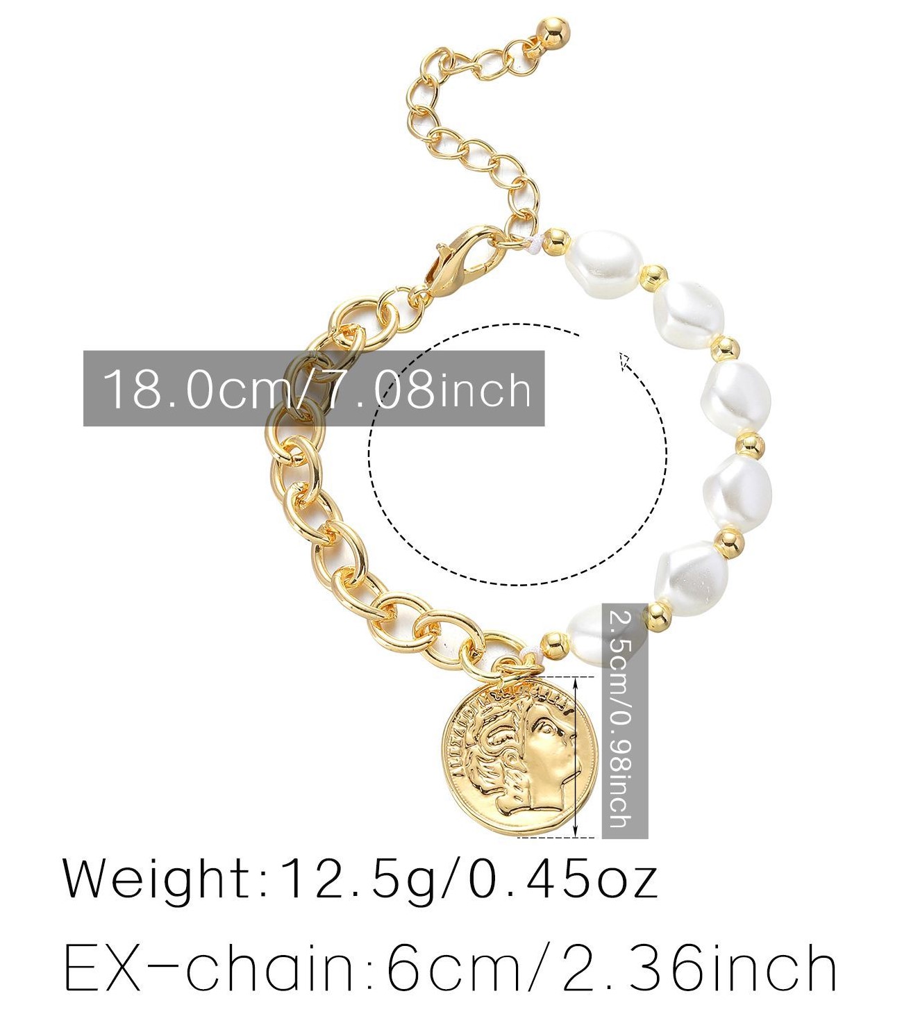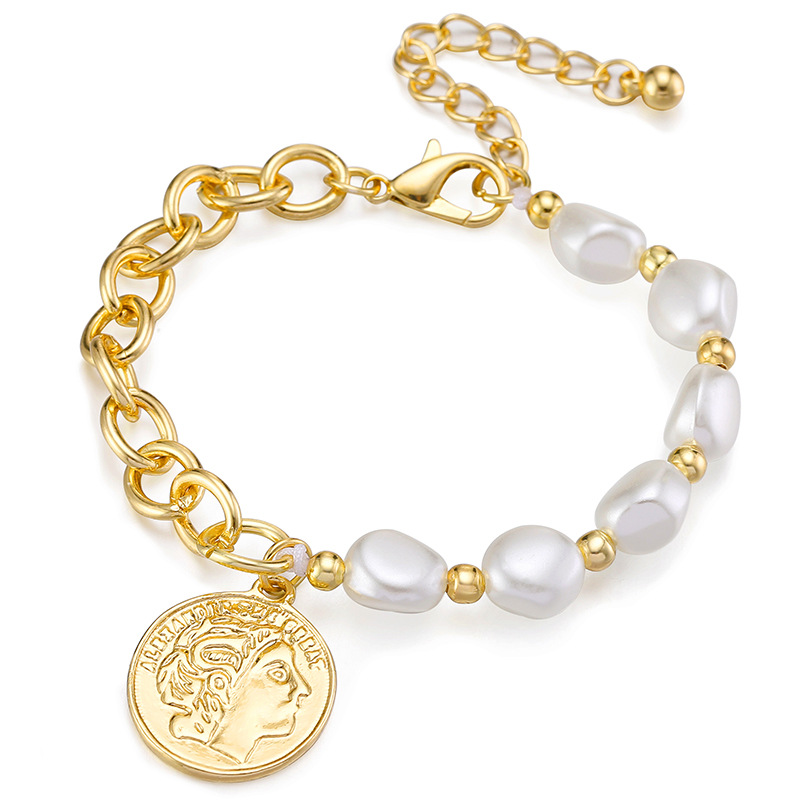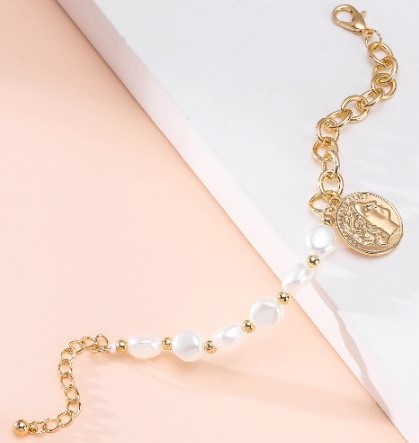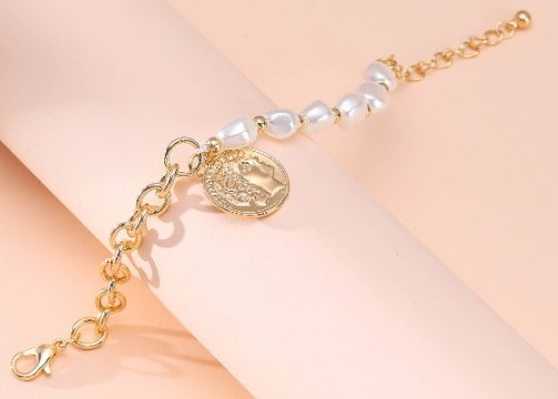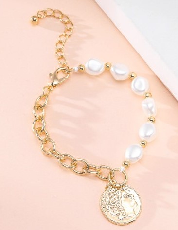 Faux Pearl Figure Coin Charm Adjustable Bracelet