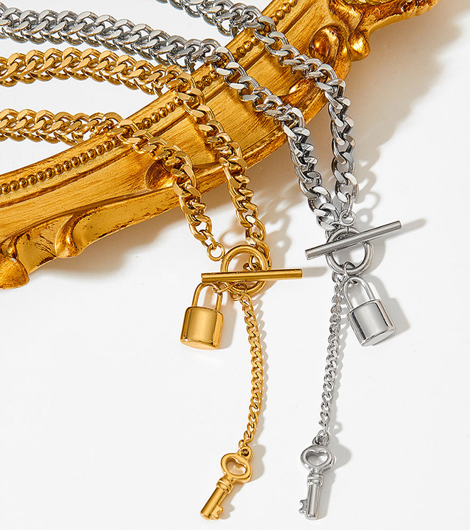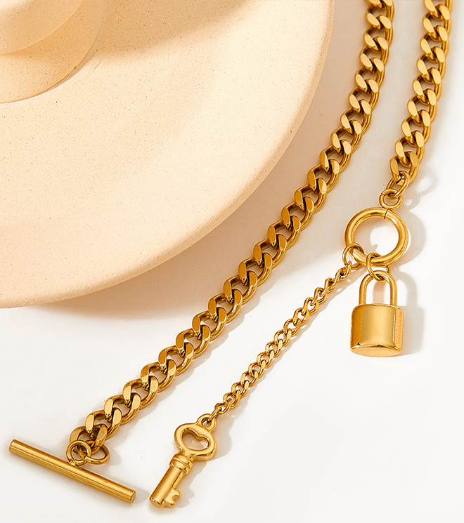 Punk Thick Chain Lock Key Charm Stainless Steel Gold Necklace