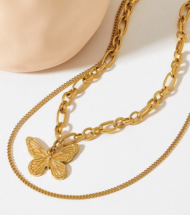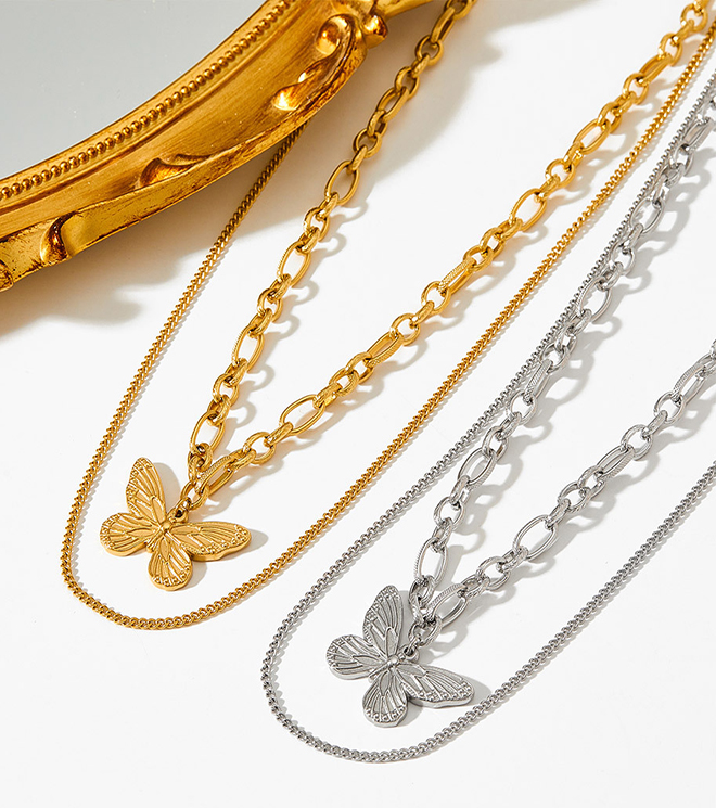 Double Layer Small Butterfly Pendant Necklace Stainless Steel Jewelry Manufacturer
