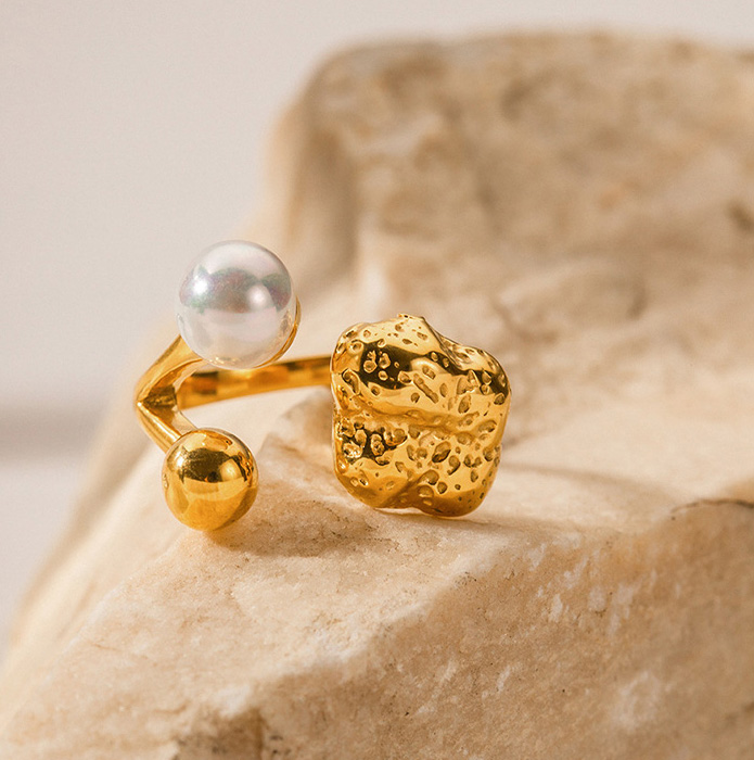Sea wave pattern imitation pearl 18K gold-plated stainless steel adjustable ring