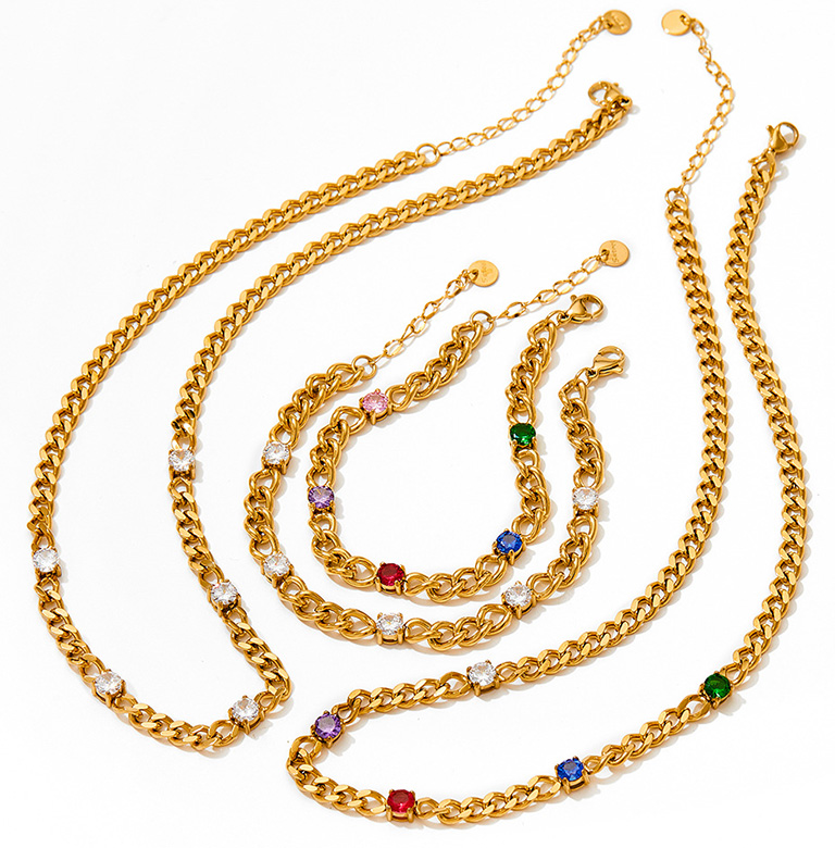 Cuban Style Stainless Steel Gemstone Necklace Bracelet Jewelry Set