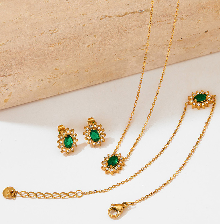 Amazon Trendy Irregular Emerald Green Zircon Earring Necklace Jewelry Sets